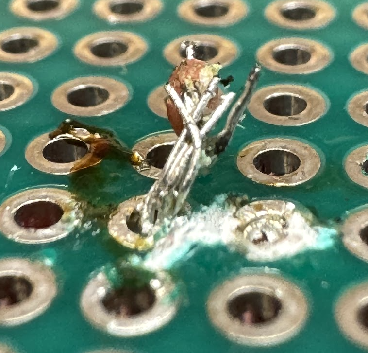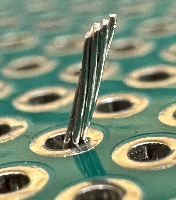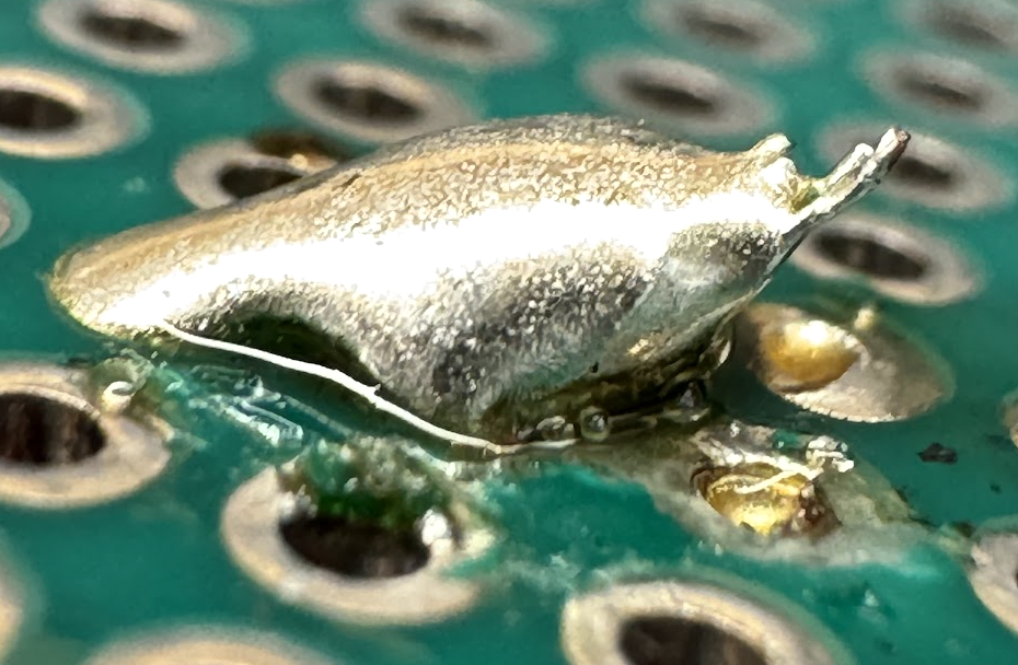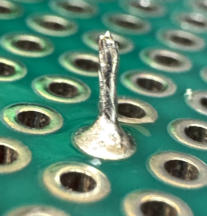 Now use the soldering iron to melt some solder into the hole, around the wire or component leg. The solder will be successful if the solder fully surrounds the wire or component leg, but you don’t need to add so much solder that it makes a bubble. You don’t need to ‘spread’ the solder, surface tension will naturally cause it to flow around your connector and fill in any holes.