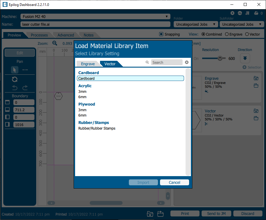 Import the Vector and Engrave settings for your material e.g 3mm Acrylic settings are imported below: