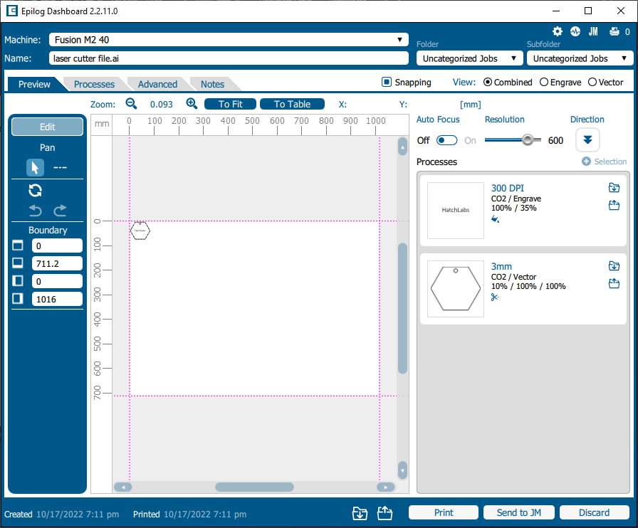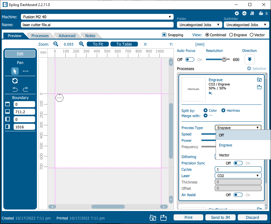 If you are happy with the cut then return to the Epilog Dashboard and click Print with the new material settings.